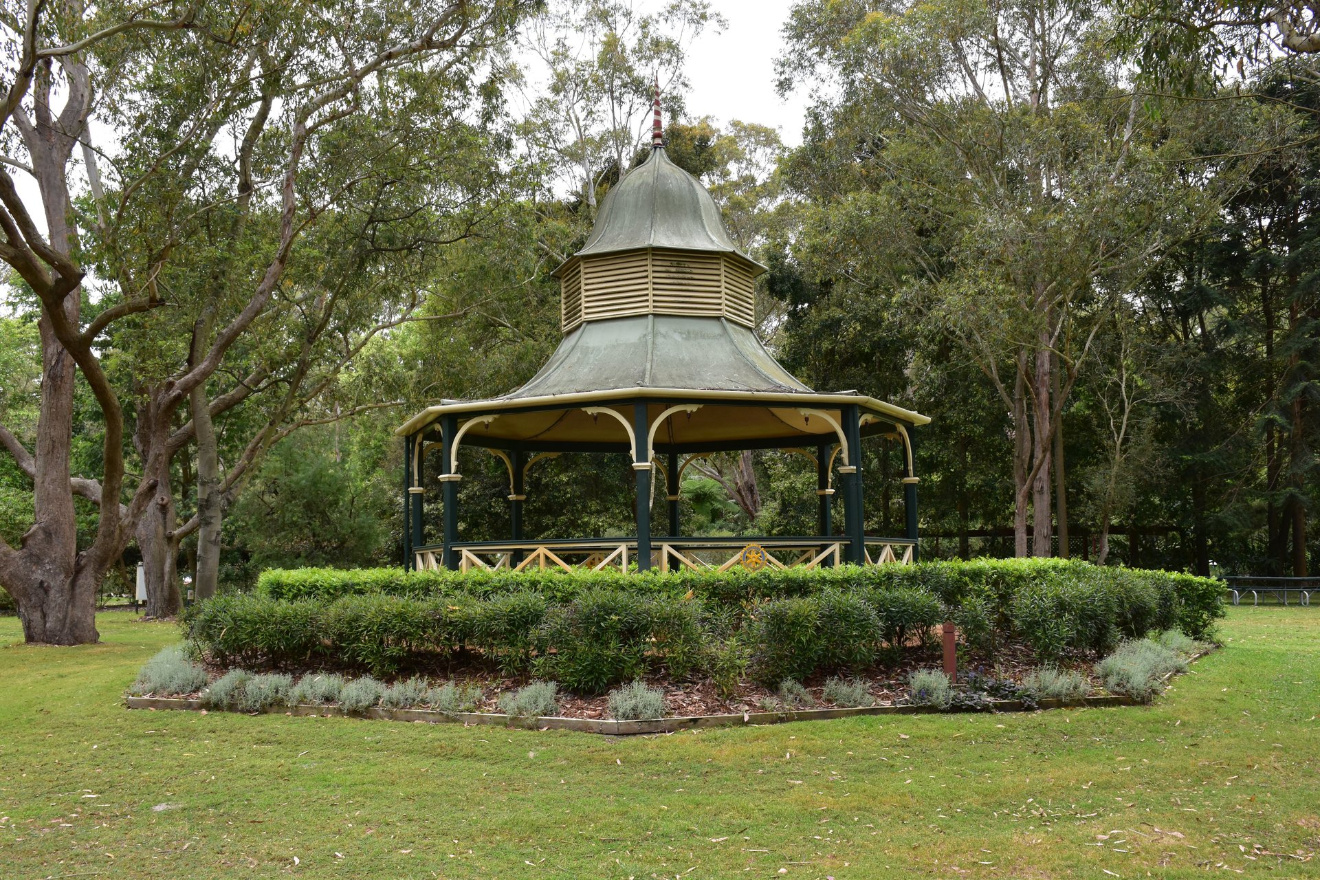 The Eucalyptus Lawn is the main open area of the Gardens. The rotunda was erected in 2003 to mark the 50th anniversary of the Raymond Terrace Rotary Club.